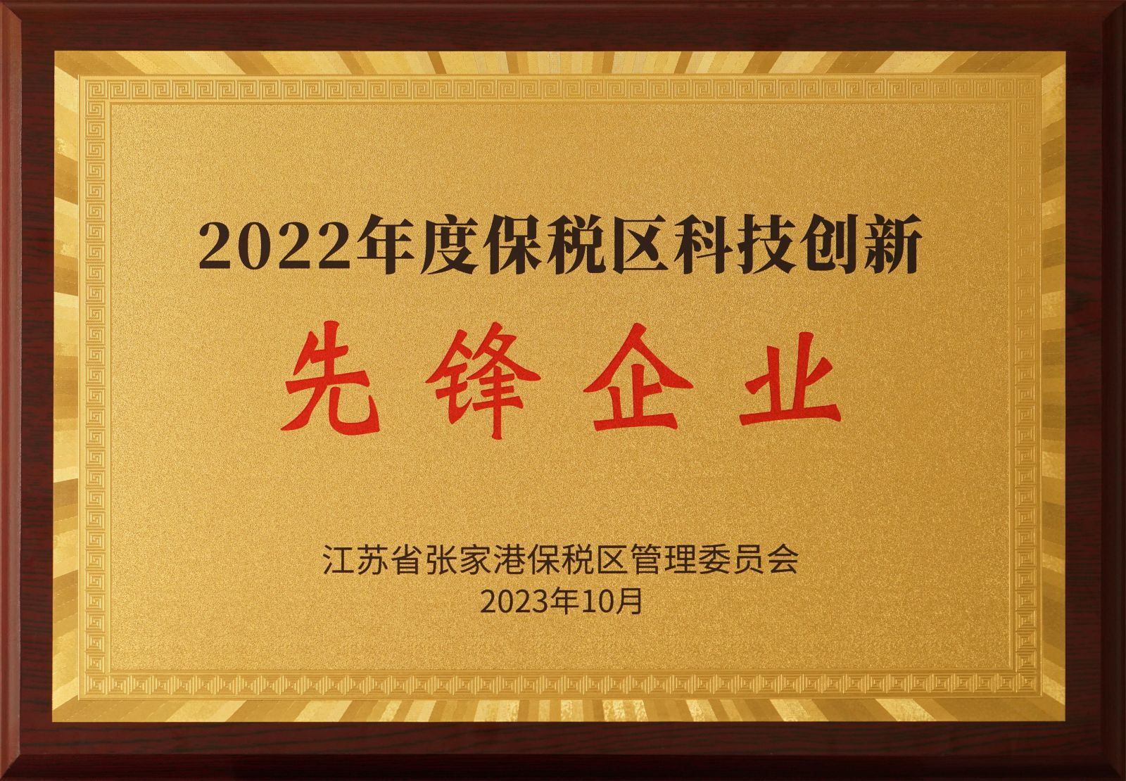 10月24日,为深入推动实施创新驱动发展战略,加快创新资源整合,促进企业转型升级,张家港市保税区召开企业科技创新推进会,总结保税区企业科技创新工作成果,部署下阶段工作重点,并为科技创新先进企业颁奖。公司在2022年度保税区研发费税前加计扣除排名中名列前茅,在会上被授予“2022年度保税区科技创新先锋企业”奖牌,公司副总经理李长胜代表公司上台领奖。