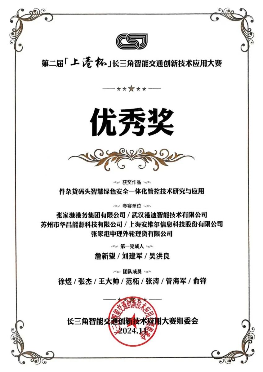 在第二届“上港杯”长三角智能交通创新技术应用大赛中,由苏州市华昌能源科技有限公司总经理徐煜作为团队主要成员之一,张家港港务集团、武汉港迪智能技术有限公司等企业联合参赛的作品《件杂货码头智慧绿色安全一体化管控技术研究与应用》,荣获大赛优秀奖。