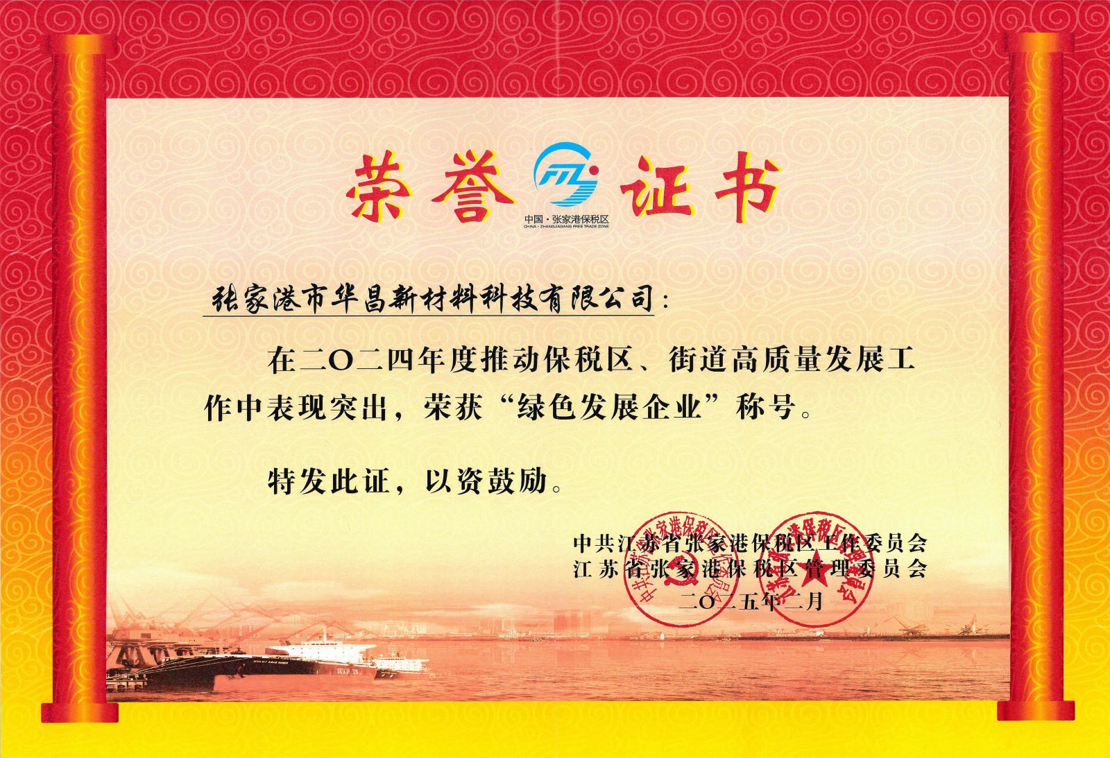 近日,张家港市华昌新材料科技有限公司荣获“绿色发展企业”称号,此次评选,保税区仅有 12 家企业获此称号,华昌新材料公司凭借在助力江苏省张家港保税区高质量发展工作中的突出表现,成功登榜。